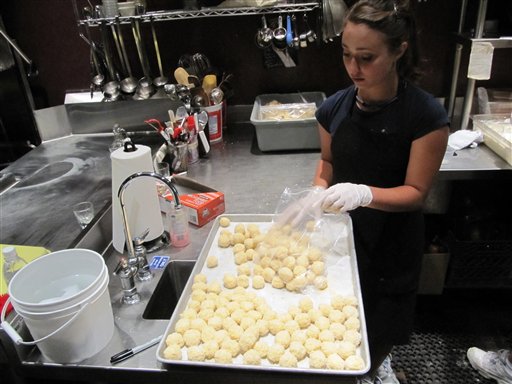 Kathryn Schaeffer dipped the pieces of dough into an egg-based mixture before covering them with bread crumbs. Her 14-year-old daughter, Christina, filled Ziploc bags and counted.