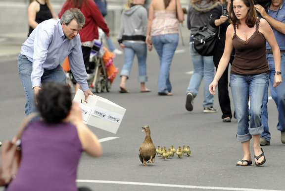 Photog buddy Jesse Tinsley posted a number of photos of recent work on his Facebook page this afternoon, including this one of the famous Momma Duck and her babies being herded by bank employees to the Spokane River. The ducks had nested on the side of a bank building.