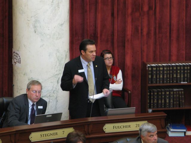 Sen. Russ Fulcher, R-Meridian, speaks out for HB 493, the education 'mastery' bill, in the Senate on Thursday; the House-passed bill would set up a pilot program to offer incentives, including scholarships, to students who move through school more quickly and graduate at least a year early. In mid-debate, Fulcher pulled the bill, saying he couldn't find the clause showing that the program was temporary; it was sent to the Senate's amending order to clarify that. (Betsy Russell)