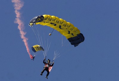 The Navy Parachute team drops into QWest Field Saturday September 8, 2007 at the opening of the WSU San Diego State football game .