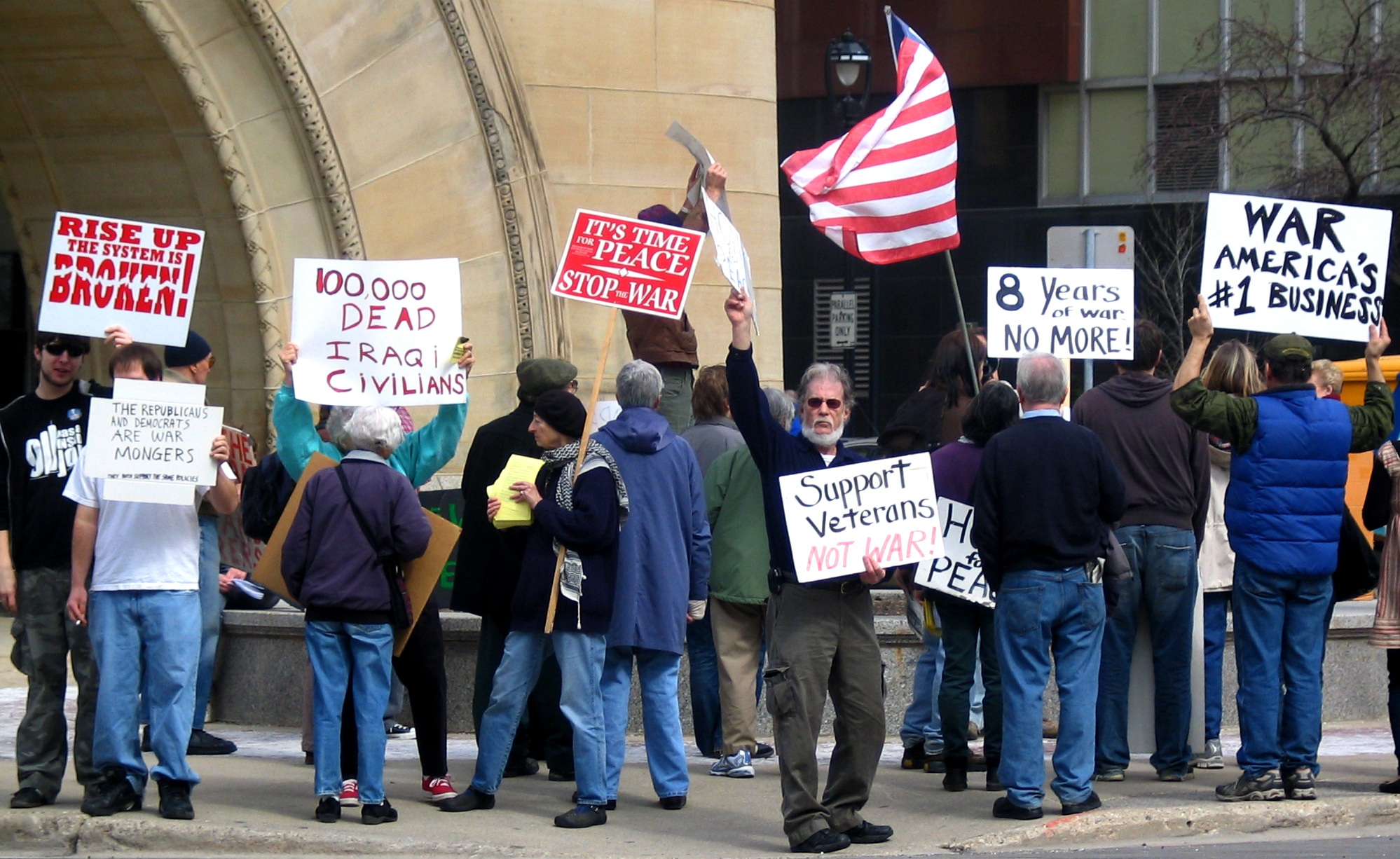Anti-war activists congregate in front of City Hall after marching through downtown Milwaukee on Friday, the seventh anniversary of the Iraq war. RALEIGH, N.C. – It was a day like any other day – except that it was the seventh anniversary of the U.S. invasion of Iraq. And, for the most part, that was forgotten.