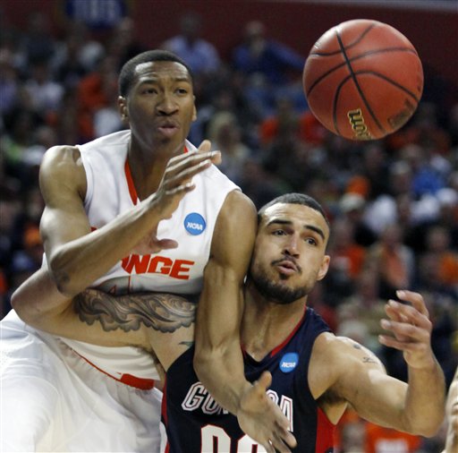 Syracuse’s Wes Johnson, left, battles for a rebound with Gonzaga’s Robert Sacre during the first half an NCAA second-round college basketball game in Buffalo, N.Y., Sunday, March 21, 2010.