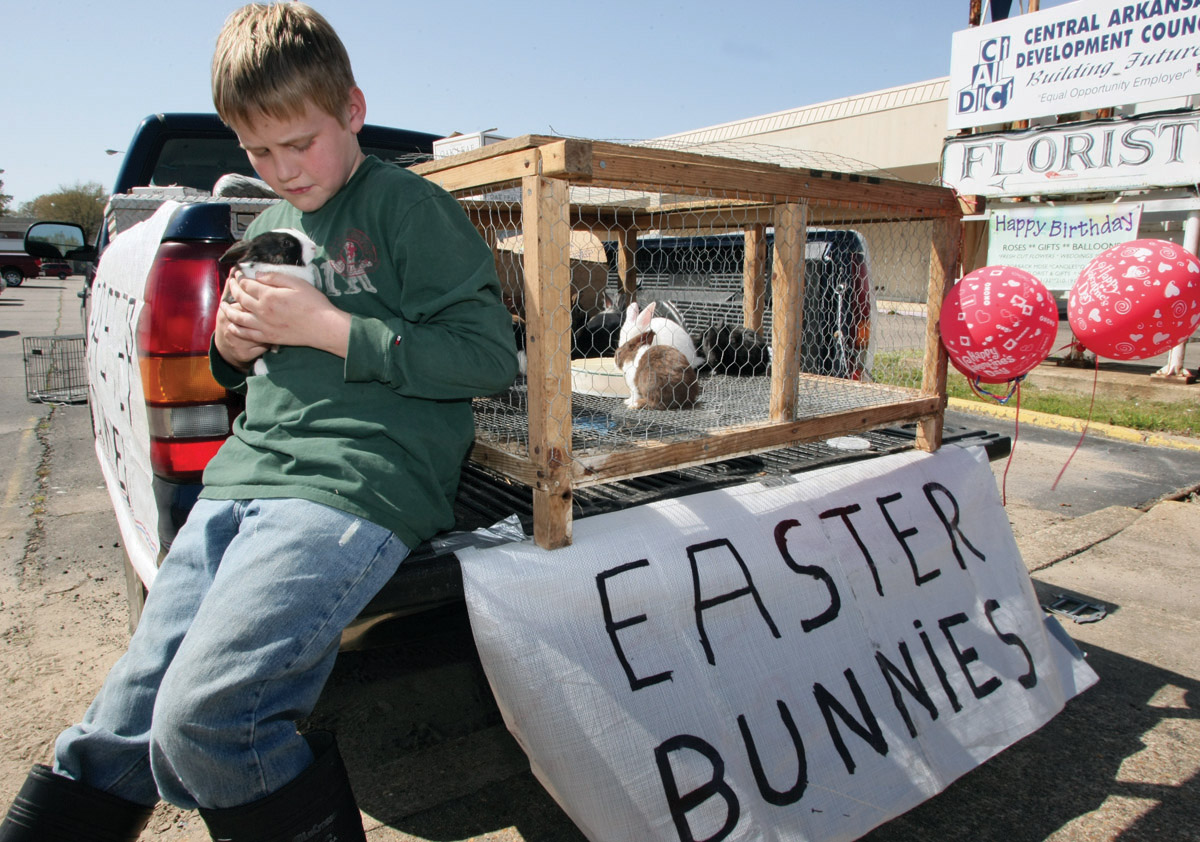 Logan Wilson, of Junction City, calms one of several Easter Bunnies he and his grandfather Glen Butler are selling, Tuesday, March 23, 2010, in the parking lot of the old Brookshires building on Northwest Avenue in El Dorado, Ark. The duo had sold about 10 bunnies by the afternoon and will be selling their limited supply of bunnies in the parking lot, everyday until Easter Sunday. (Michael Orrell / The El Dorado News-times)