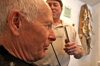 Jim Aiken of The Pend Oreille Barbershop snips Don Childress’ top as the men contemplate fishing. Ralph Bartholdt/Skookum Photography writes of his visit to the old-fashioned barbershop here . (Skookum Photography: Ralph Bartholdt)