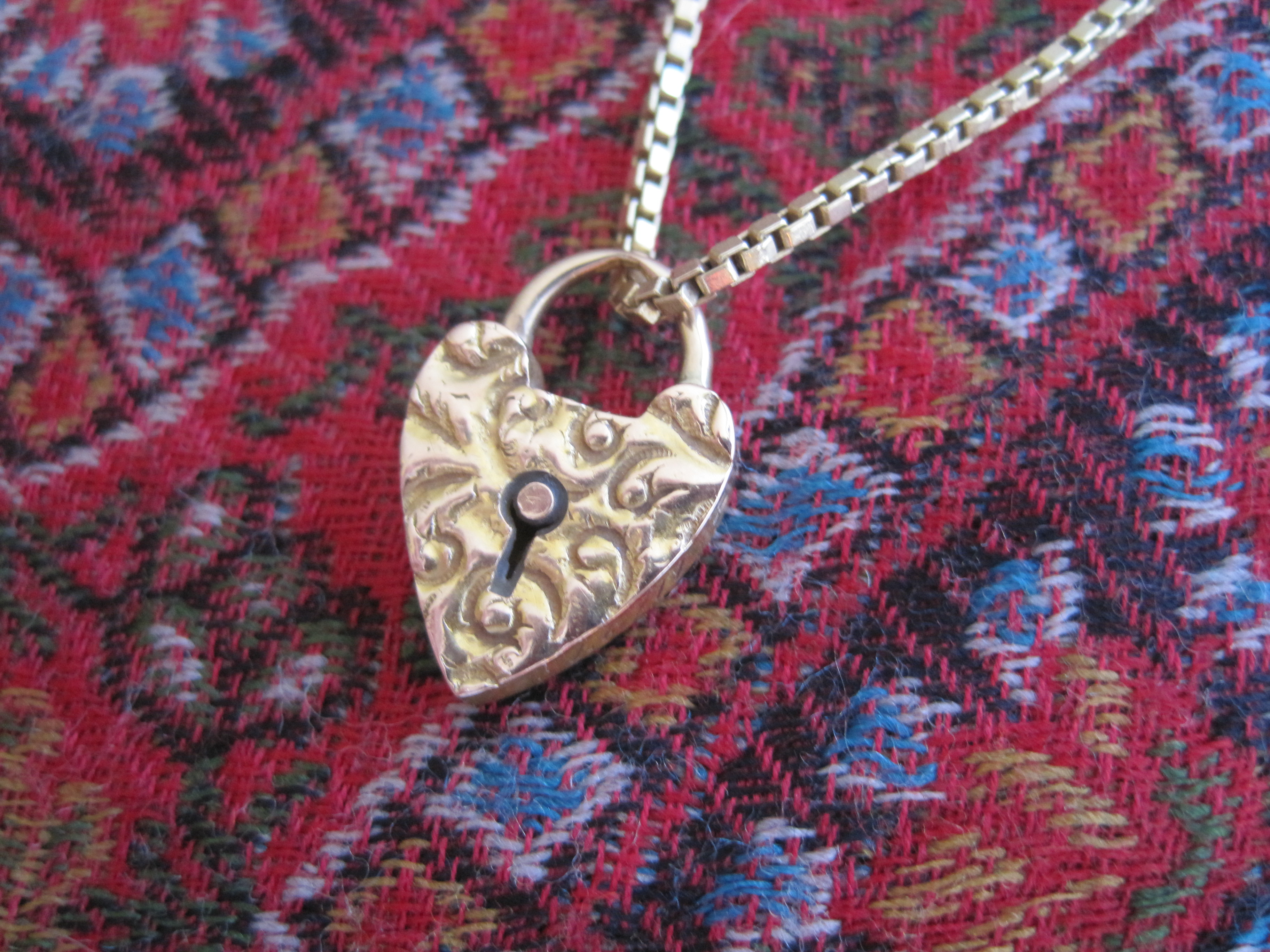 Years ago, I was poking around an estate sale. I picked up a bracelet that had one tiny crystal on one of the links and the little lock as a clasp. The piece was lightweight and made a distinctive “pink” sound when I shook my hand.