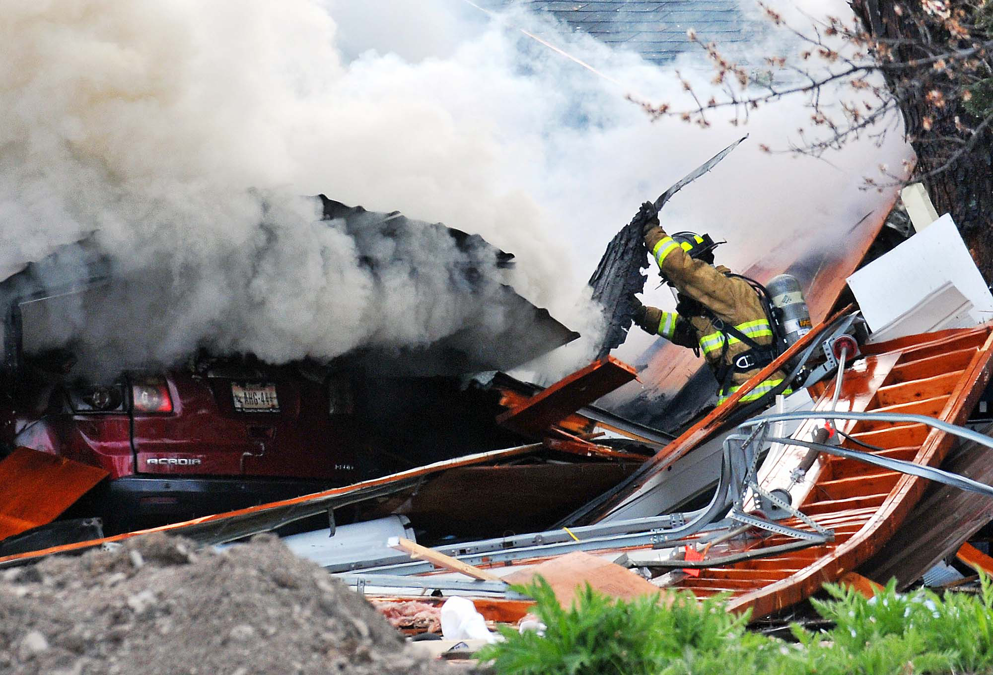 A Columbia Falls firefighter moves a piece of a debris out of the way as smoke rises from a collapsed carport in Columbia Falls, Mont., Thursday afternoon. A Columbia Falls house exploded Thursday as utility workers were trying to fix a natural gas leak, killing one of the workers, leveling the home and scattering glass and debris as far as a quarter-mile away, authorities said. (AP Photo/The Daily Inter Lake, Nate Chute)