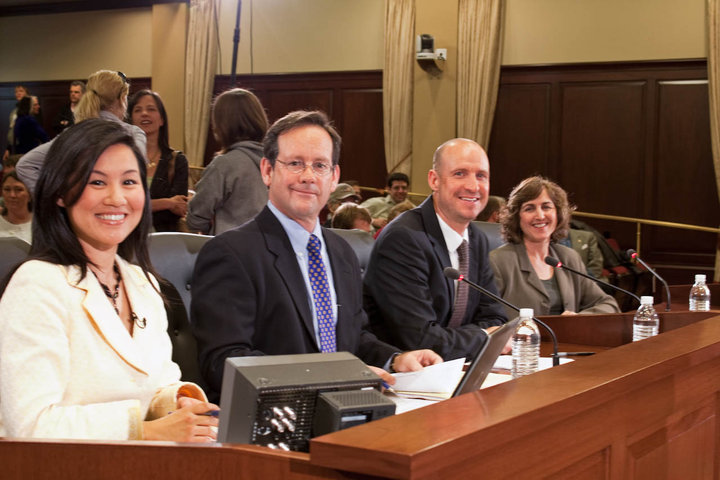 Moderator Thanh Tan with the 1st CD Debate Panel (L-R): Dan Popkey of the Idaho Statesman, John Miller of the Associated Press and Betsy Russell of the Spokesman-Review