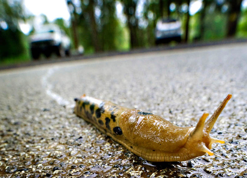 A large Pacific banana slug slowly crosses a rural road near Oakland, Ore. The Pacific banana slug is the second-largest species of terrestrial slug in the world, growing up to 25 centimetres (9.8 in) long. (Credit Image: © Robin Loznak/robinloznak.com)