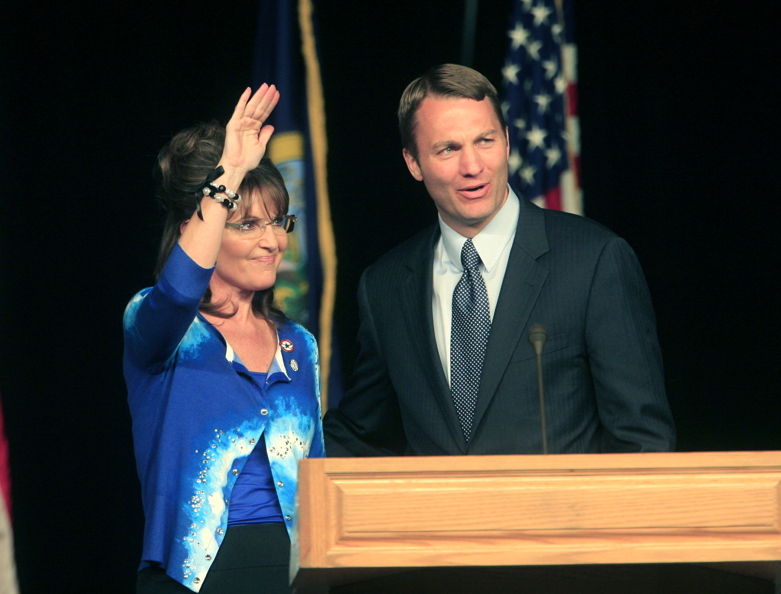 Former Alaska Gov. Sarah Palin and Idaho GOP congressional candidate Vaughn Ward wave to the crowd during a rally for Ward at Qwest Arena this morning in Boise. (AP Photo/The Idaho Statesman, Chris Butler)
