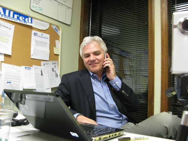 Democratic gubernatorial candidate Keith Allred held a different kind of election-night gathering tonight - he and volunteers gathered at his campaign headquarters, where they stuffed envelopes, fielded calls and worked on a mailing and other projects. Longtime Democratic activist Betty Richardson said it was the first working party for election night she could recall.