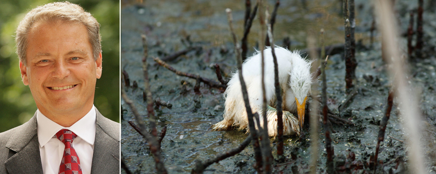 On the right hand side of the picture we see one of hundreds of thousands of water fowl being killed by or maimed by BP crude oil wafting up on the beaches of the Gulf Coast. That is but one of a host of sea birds, fish and crustaceans already killed by the oil spill, and presumably more will die before this sad ordeal is over and the sludge is cleaned up.