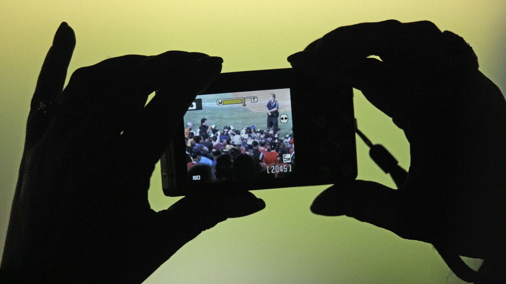 A fan takes pictures of the San Francisco Giants celebrating after Game 5 of baseball’s World Series against the Texas Rangers Monday in Arlington, Texas. The Giants won 3-1 to capture the World Series. (AP Photo/Tony Gutierrez)