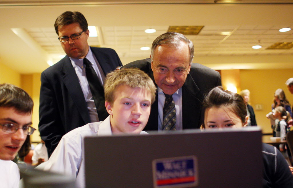 Idaho first-congressional district incumbent congressman Walt Minnick (D) monitors election results at his election-night party with son Dixon, 17, (to Minnick’s immediate right) and campaign staffer Dean Ferguson (background) on Tuesday night. (AP Photo/Joe Jaszewski - Idaho Statesman)