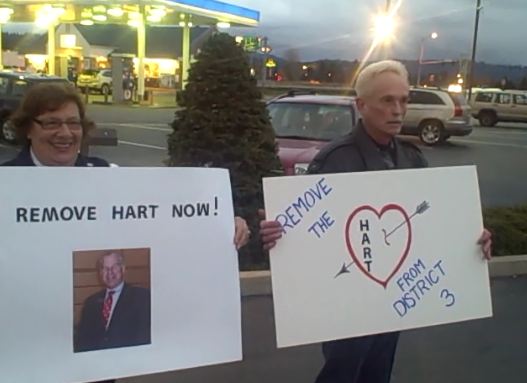 Four bus loads of legislators encountered a small group of people protesting against Rep. Phil Hart when they drove into the Coeur d’Alene Inn a few minutes ago. The individual holding the sign on the right is Howard Griffiths, who won 25 percent of the vote as a write-in against Hart last Tuesday.