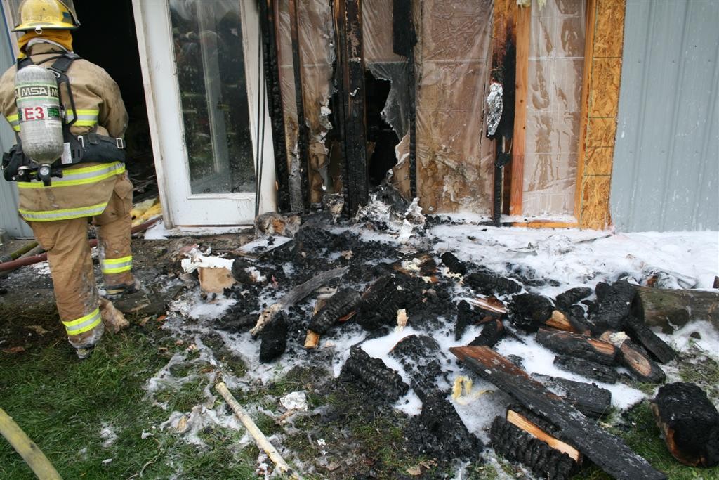 A home in the 4300 block of North Harvard Road was damaged by fire Nov. 8 when hot wood stove ashes caught a wood pile on fire and spread the flames to the home. Damages were estimated at $150,000. (Photo courtesy the Spokane Valley Fire Department)