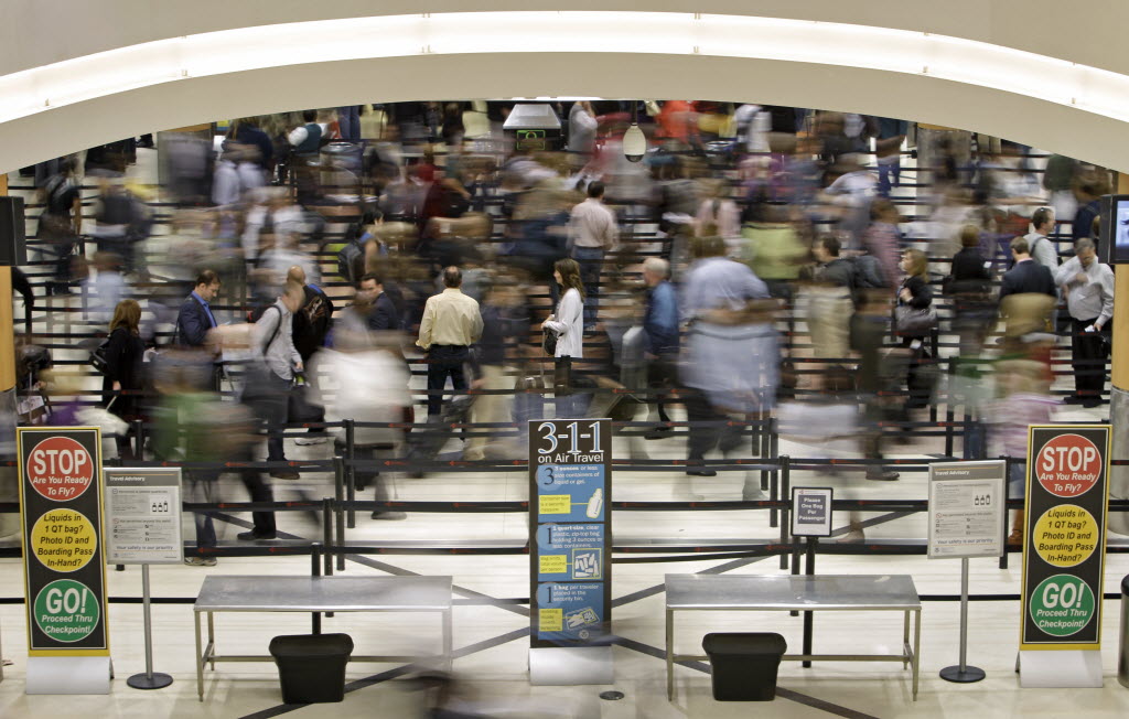 Passengers move through the line at a security checkpoint at Hartsfield-Jackson Atlanta International Airport Thursday in Atlanta. In a climate of Internet campaigns to shun airport pat-downs and veteran pilots suing over their treatment by government screeners, a senior Republican lawmaker is urging the country’s busiest airports to scrap federal screeners altogether. (AP Photo/David Goldman)
