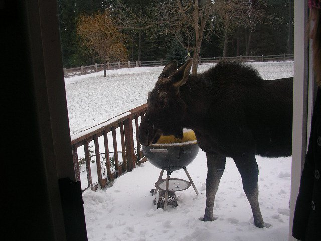 In Sagle, Berry Picker Arpie reports that “It’s shaping up to be a moosey winter. A one-antlered bull was seen in town near some friends, and I saw two skiing Sunday. We’ve lived here 12 years and this is the first moose we’ve seen in our yard. This photo was taken today. My kids wouldn’t let me chase him off like I wanted to after he was munching my clematis.”