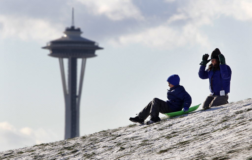 A sledder starts downhill after a push as the Space Needle is seen behind Tuesday in Seattle’s Gasworks Park. A vicious storm struck the Pacific Northwest and other western states at the start of the holiday travel season, dumping heavy snow on roads, knocking out power to tens of thousands of people and causing a cargo plane to overshoot its runway in Seattle. At least three deaths in Washington state have been blamed on the storm, including a man struck and killed outside his car Monday night on snowy Interstate 5 in Tacoma. (AP Photo/Elaine Thompson)
