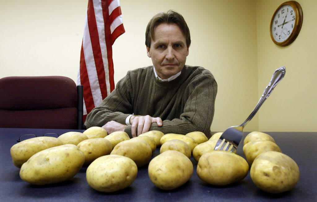 The head of the Washington State Potato Commission Chris Voigt poses for a photo in Moses Lake, Wash. Voigt challenged himself to live on a potato-only diet for 60 days. He’s cooked them every way but didn’t allow butter, sour cream or any of the usual high-calorie toppings. Voigt, head of the state potato commission, wanted to make a point about the humble spud’s rich nutrients. You write the cutline. (AP Photo/The Seattle Times, Alan Berner)