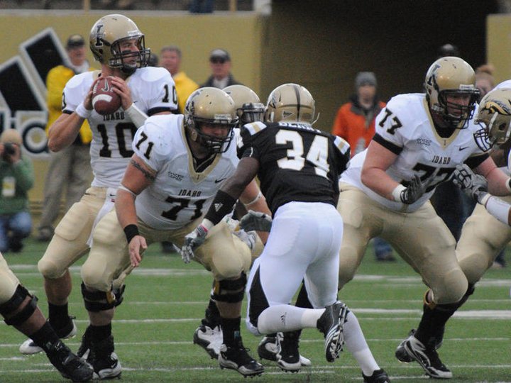 Idaho QB Nathan Enderle receives good protection from his offensive line as he looks downfield to pass in the Vandals’ 33-13 victory over host Western Michigan earlier today. Idaho Vandals Athletic Media story here . And: Photo courtesy Idaho Vandals Facebook page.
