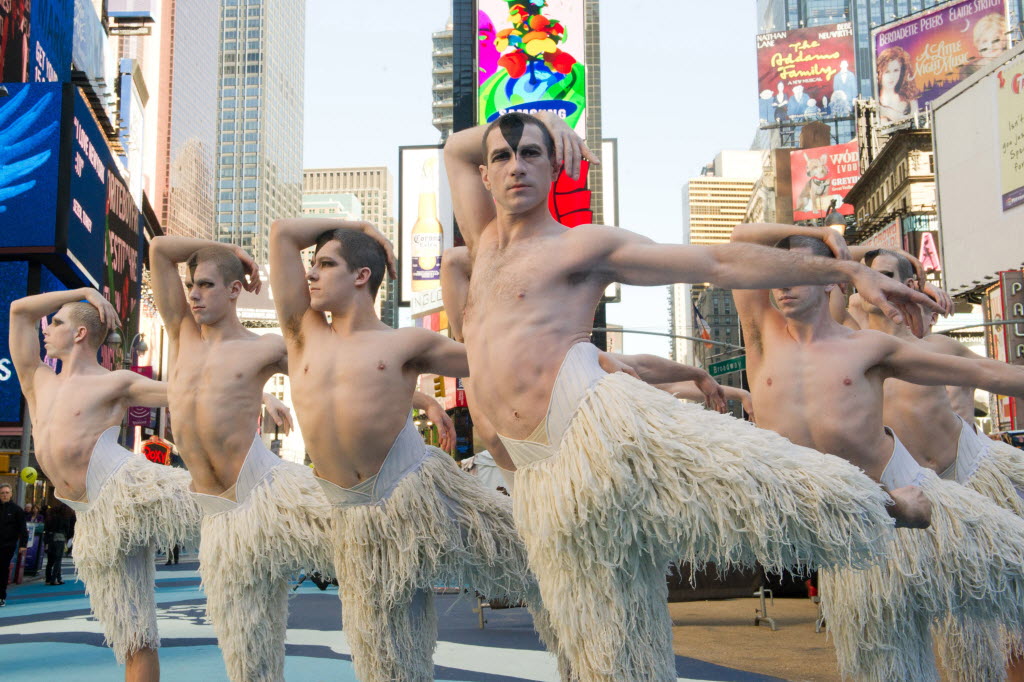 An ensemble of dancers dressed in swan costumes pose for a photo in Times Square to promote Matthew Bourne’s “Swan Lake” returning to Broadway, in New York, earlier today. You write the cutline. (AP Photo/Charles Sykes)