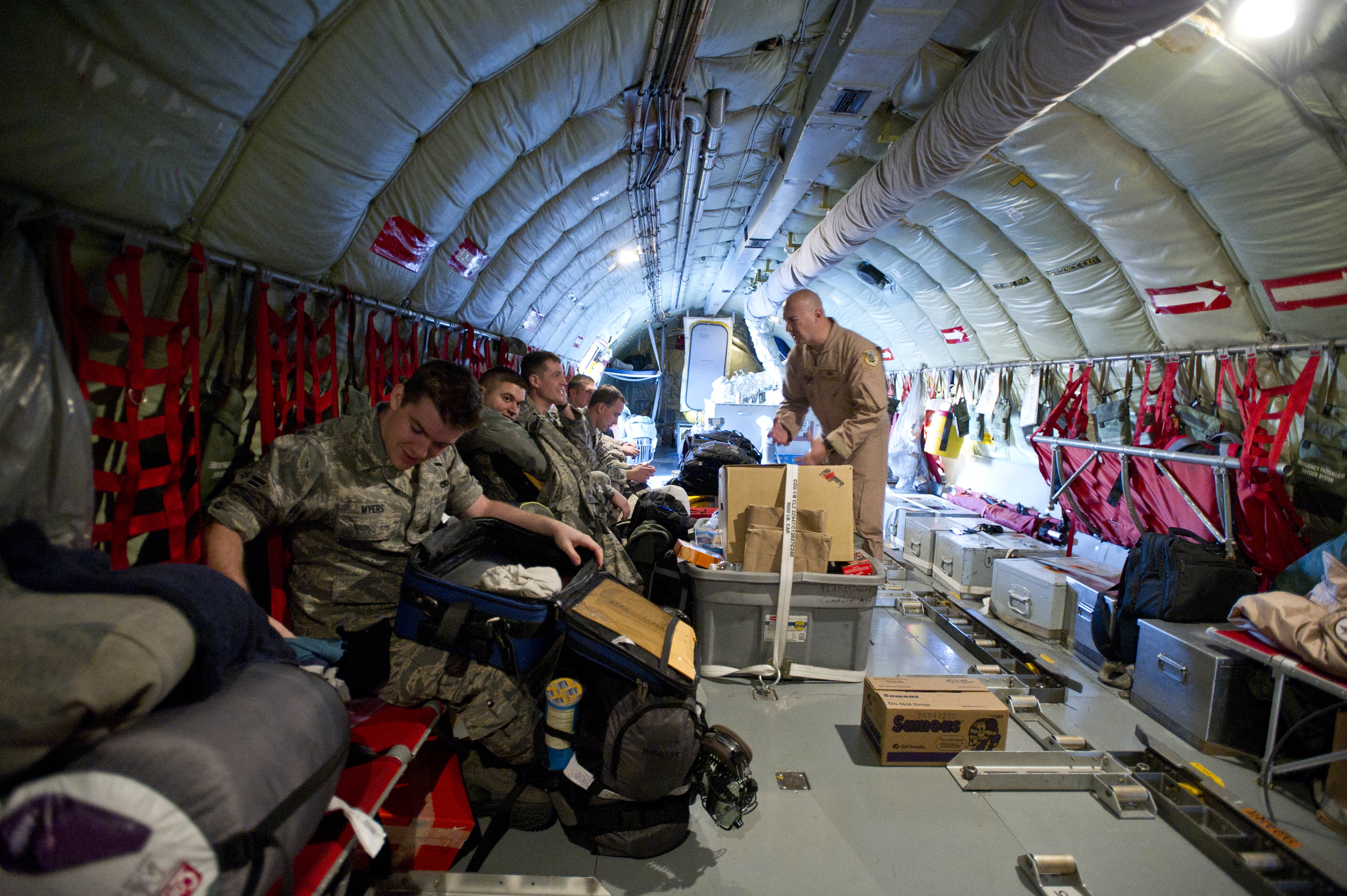 Airmen with the 92nd Air Refueling Wing at Fairchild Air Force Base strap in for a seventeen hour flight to the Manas Transit Center in Kyrgyzstan. The aircrew and five maintainers are in route to Kyrgyzstan aboard a Fairchild KC-135R Stratotanker refueling aircraft for a five-month deployment.