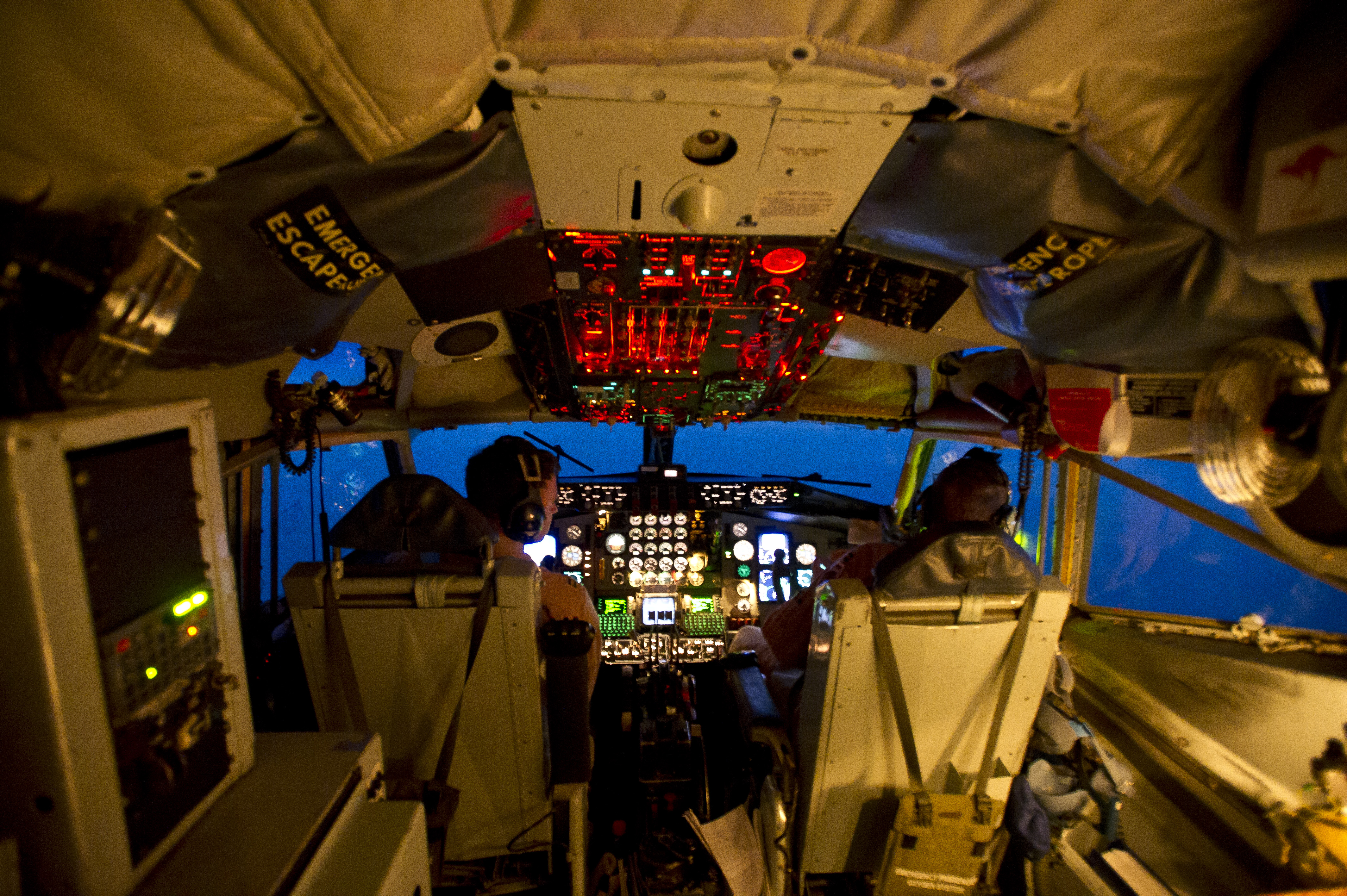 After an overnight in England, Capt. Chris Dieter and his co-pilot Lincoln Olsen prepare to land their KC-135R Stratotanker at Manas Transit Center Oct. 15, 2010. The night before, over the Atlantic Ocean, the crew was given a front row seat to a massive Northern Lights show.
