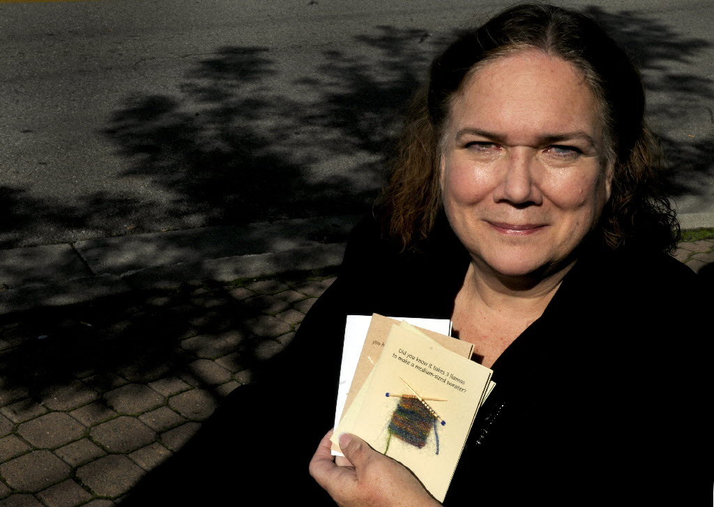 Kim Cheeley, of Itty Bitty Witty Knitties in Coeur d’Alene, makes greeting cards out of handmade knitted swatches and quilts by a group of women from south-central China who participate in the vocational-training programs of Asia Project Grace. Laura Umthum story in Handle Extra here . (SR Photo: Kathy Plonka)