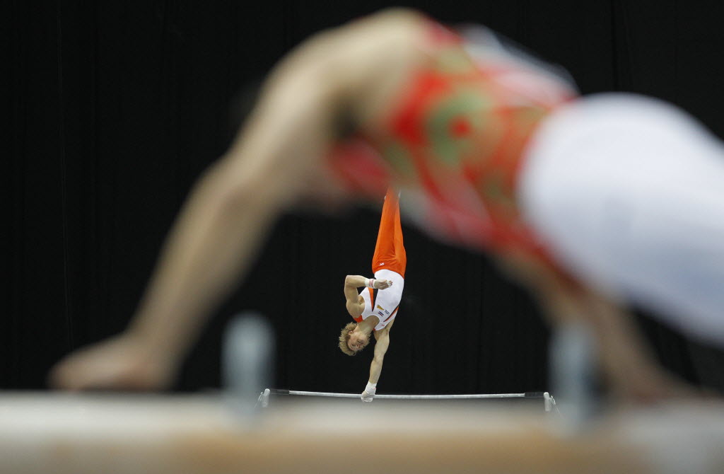 Epke Zonderland of The Netherlands, rear, performs on the horizontal bar as an athlete from Iran performs on the pommel horse, foreground, during the men’s qualifying session for the World Gymnastics Championships in Rotterdam, Netherlands, earlier today. (AP Photo/Bas Czerwinski)