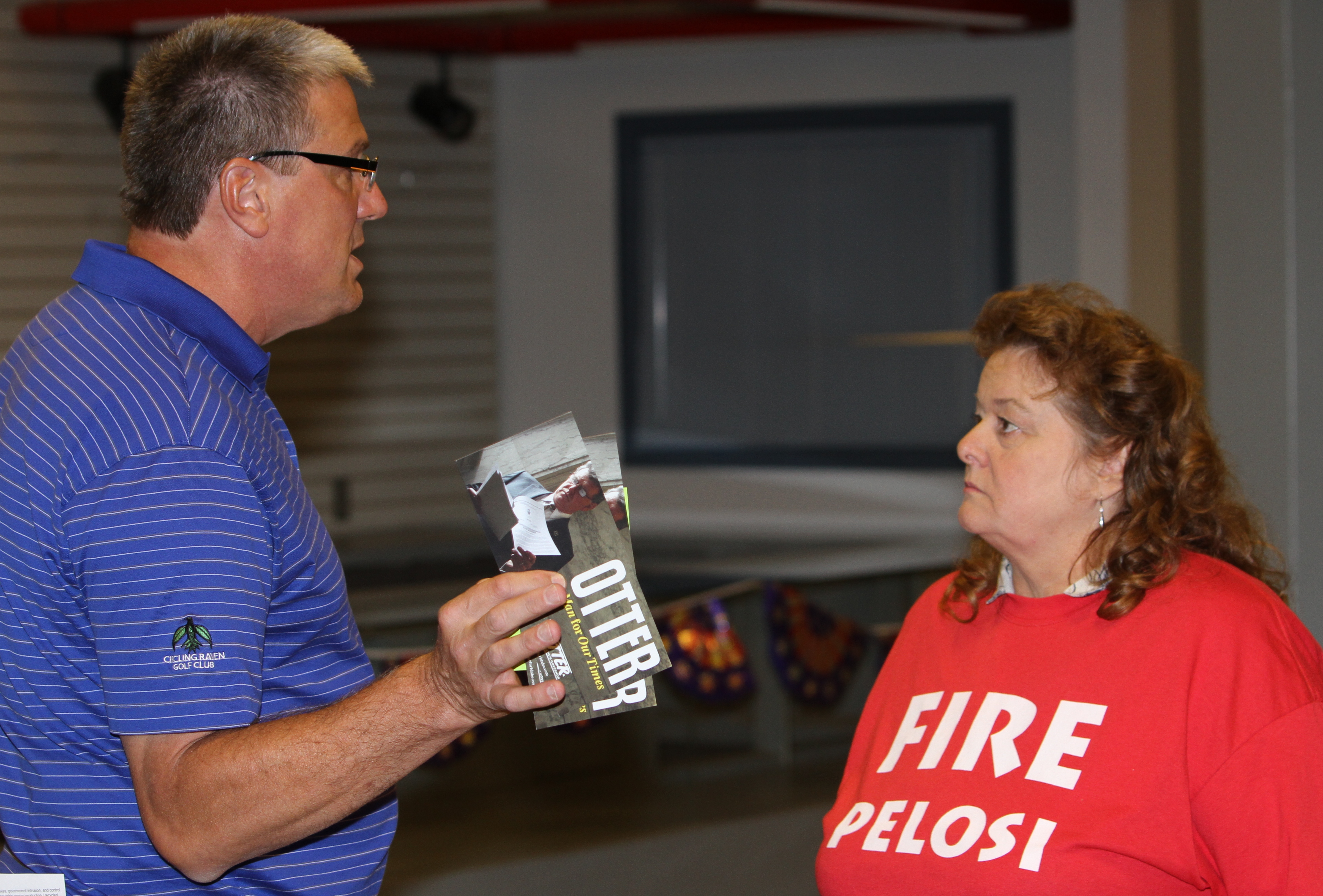 Tina Jacobson, who has filled in for Rep. Phil Hart at the Idaho Legislature, glares at state committeeman Matt Roetter at a Tea Party rally at Greyhound Park earlier this year. Write-in candidate Howard Griffiths was in attendance. And Tina apparently had learned for the first time that Matt wasn’t supporting Hart for re-election. Now, Matt is facing a move by local Republicans to oust him from his elected position for not supporting Hart in the general election. Earlier this morning, I published a post in which state GOP chairman Norm Semanko decreed that elected GOP party members must support Republican candidates no matter what.