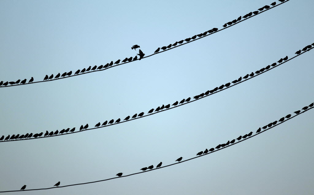 A bird looks for an open place to land on power lines filled with birds in Carmel, Ind., Wednesday. You write the cutline. (AP Photo/Michael Conroy)