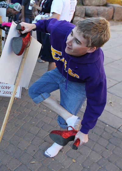 University of Wyoming sophomore Tyler Kirby has a sense of relief after slipping off women’s high heel shoes after taking three laps around Prexy’s Pasture during “Walk a Mile in Her Shoes” Wednesday in Laramie, Wyo. The men’s march is to stop rape, sexual assault and gender violence during domestic violence month. (AP Photo/Laramie Boomerang, Andy Carpenean)