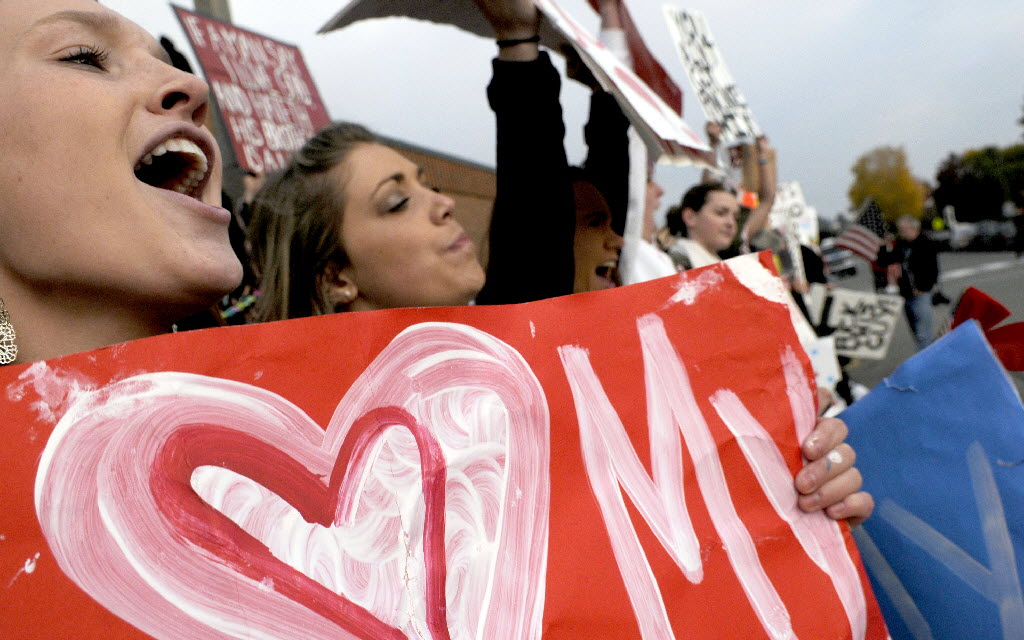 Alisha Nowoj, far left 18, of Coeur d’Alene helped counter- protest the members of Westboro Baptist Church at North Idaho College this morning. (SR Photo: Kathy Plonka)