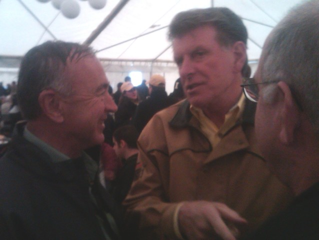 This isn’t the highest quality of photo. But the material in it makes it worth publishing. Here, Democratic Congressman Walt Minnick gabs with Republican Gov. Butch Otter in a pre-game event in Moscow this weekend prior to the Homecoming Game between the University of Idaho and New Mexico State.