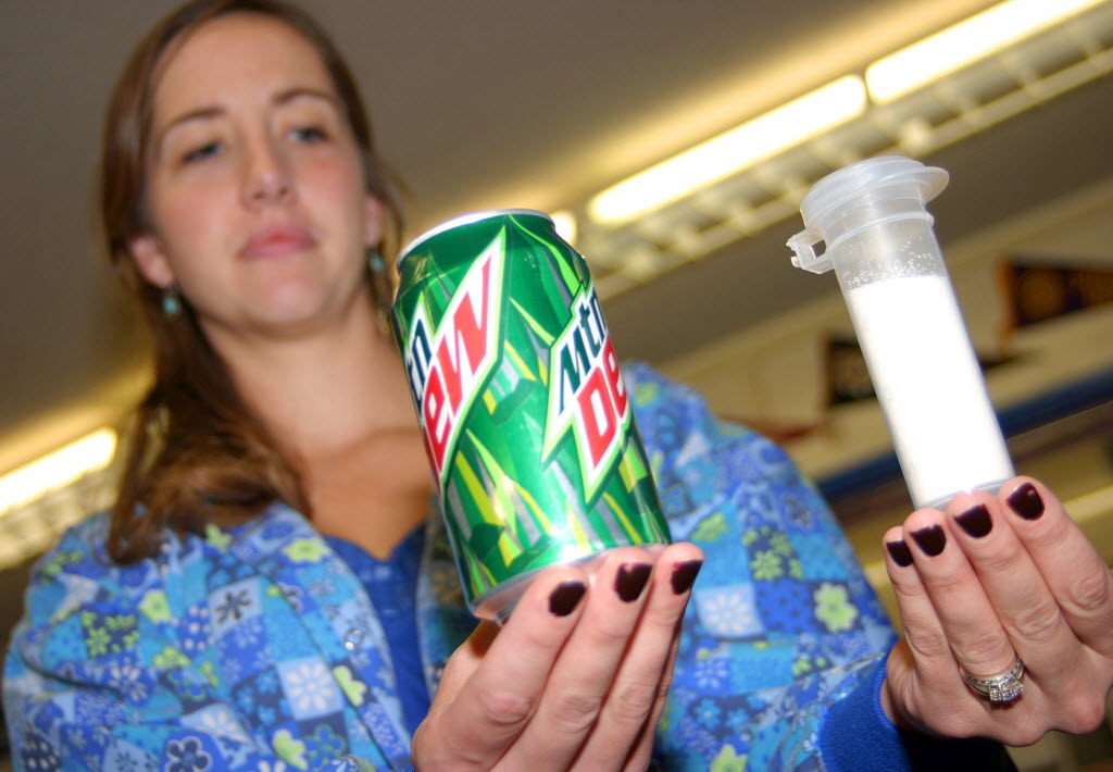 Havre Public Schools nurse Jana Nordboe demonstrates how much sugar is in a 12-ounce can of Mountain Dew in Havre, Mont. (AP Photo/ Havre Daily News, Nikki Carlson)