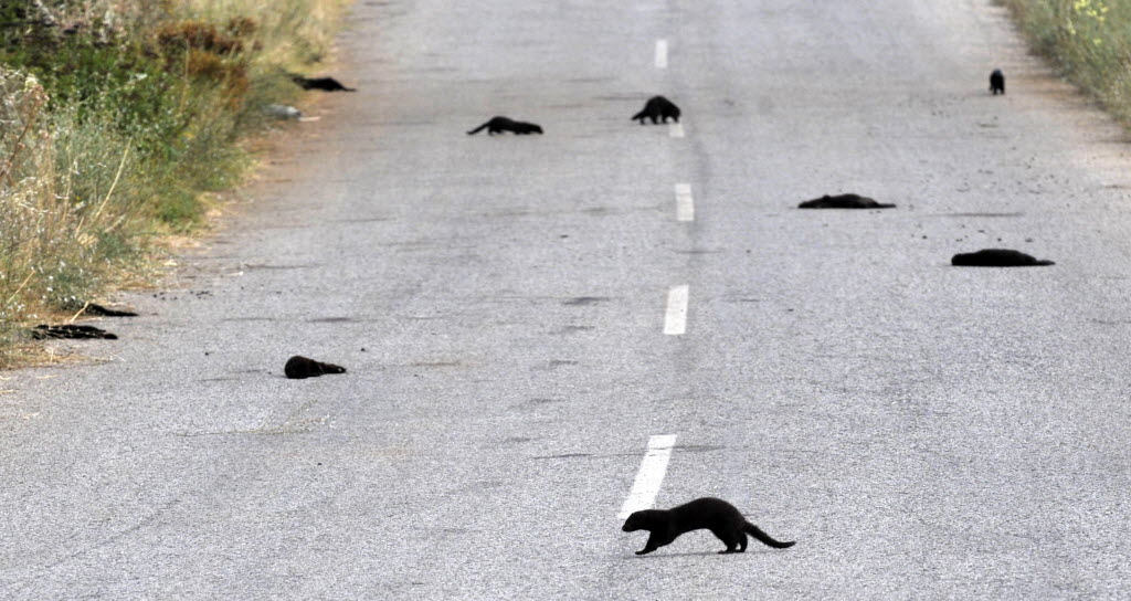 Yeah, I know, I published this photo as a stand-alone Monday. But it deserves more than that — like APhoto of the Day honors. Here, a mink runs past dead animals on a road in Hiliodendro, Greece Monday. More than 50,000 minks were set loose in the area on Friday and Saturday, after raids by suspected animal rights activists on two fur farms. As you can see, other minks didn’t make it. You write the cutline. (AP Photo/Nikolas Giakoumidis)