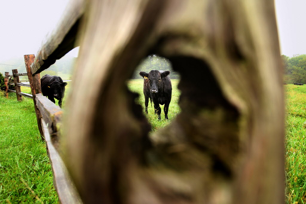 A beef cow looks through a hole in a wooden fence while grazing in a field near Dubuque, Iowa. You write the cutline. (AP Photo/Telegraph Herald, Dave Kettering)