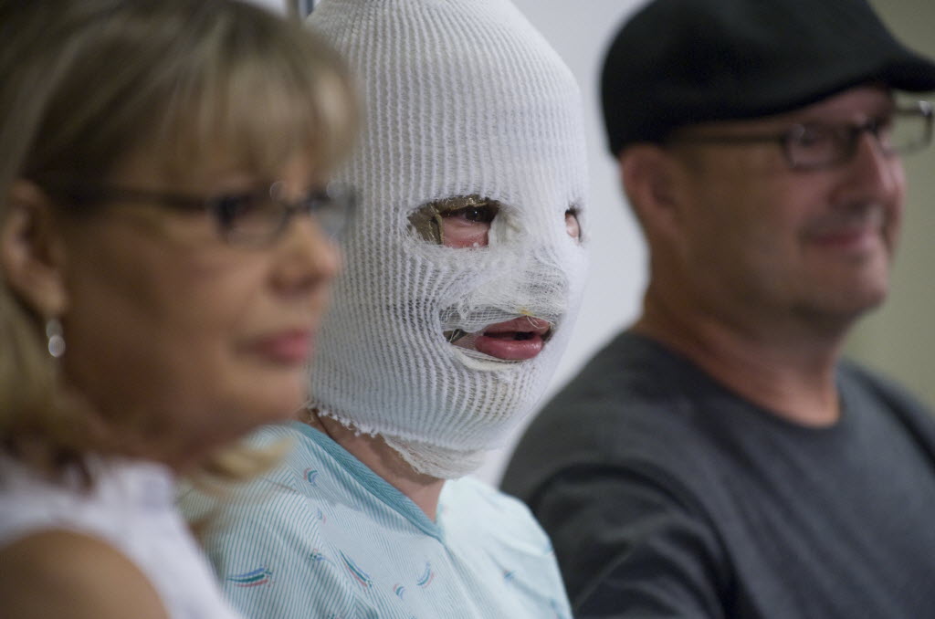 Bethany Storro, who was a victim of a random attack by a woman who threw acid in her face near Esther Short Park earlier in the week, is flanked by her parents Nancy and Joe Neuwelt, during a news conference at Legacy Emanuel Hospital in Portland, Ore., today. See story below. (The Columbian/Zachary Kaufman)