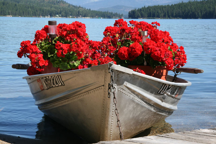 A boatload of Duane Hagadone’s favorite flower — red geraniums — showed up on the shore of Priest Lake … and Pecky Cox/As The Lake Churns was there with her handy camera to note the event.