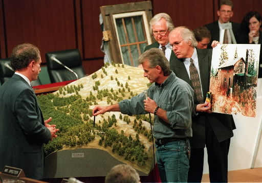 White separatist Randy Weaver points to his cabin on a model of his Ruy Ridge, Idaho, property while testifying on Capitol Hill Sept. 6, 1995, before a Senate Judiciary subcommittee which was holding hearings on the 1992 raid on his cabin. Subcommittee Chairman Sen. Arlen Specter, R-Pa., left, along with attorneys Gary Gilman, right, holding photo of the cabin, and Gerry Spence, second from right, look on. Now, Weaver’s daughter, Sarah Weaver-Balter, of Kalispell, Mont., discusses the