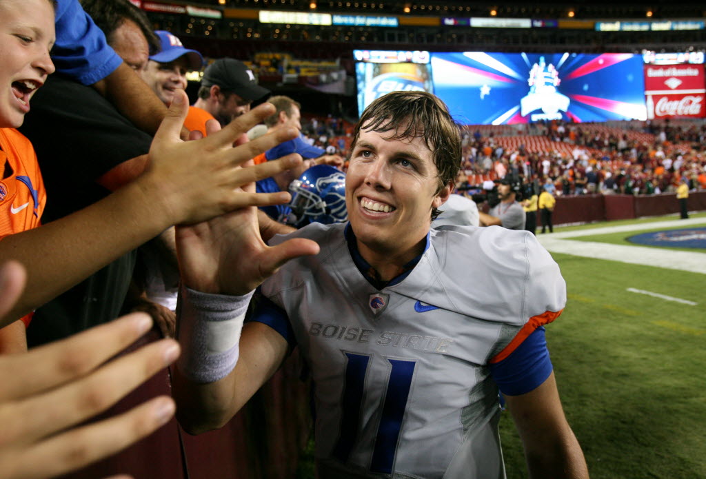 Boise State’s Kellen Moore hi-fives fans after beating Virginia Tech 33-30 at FedEx Field in Landover, Md., on Monday. Now, Moore has been named The O’Brien Quarterback of the Week. See Statesman story here . (AP Photo/Idaho Statesman: Joe Jaszewski)