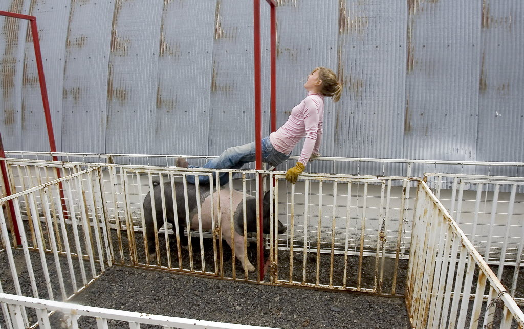 Roxanne Allenbach, 12, of Colfax, Wash., tries herding Buddy the pig through the Swine Barn entrance chute at the Palouse Empire Fair earlier today, outside Colfax. Allenbach was helping her brother and friends with the pigs. She will show a steer at the fair. (AP Photo/Moscow-Pullman Daily News)