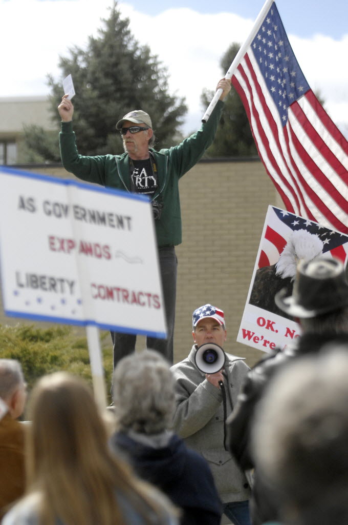 In this April 7 AP file photo, Tim Ravndal waves an American flag while holding a copy of the Constitution as Jim Walker speaks to the crowd through a blow horn outside the state Justice Department in Helena, Mont. (AP Photo/Independent Record, Lisa Kunkel)
