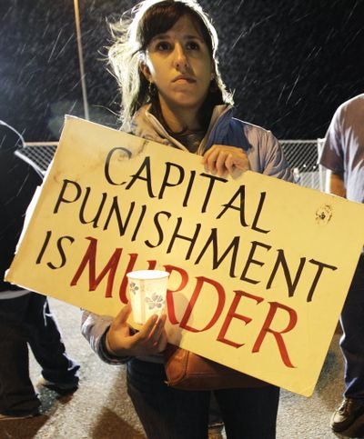 Mimi Pysno, a student at Whitman College in Walla Walla, Wash., stands in a light rain as she takes part in a candle light vigil outside the Washington State Penitentiary Thursday in Walla Walla. Cal Coburn Brown was executed after midnight today for the 1991 murder of Seattle-area woman. (AP Photo/Ted S. Warren)
