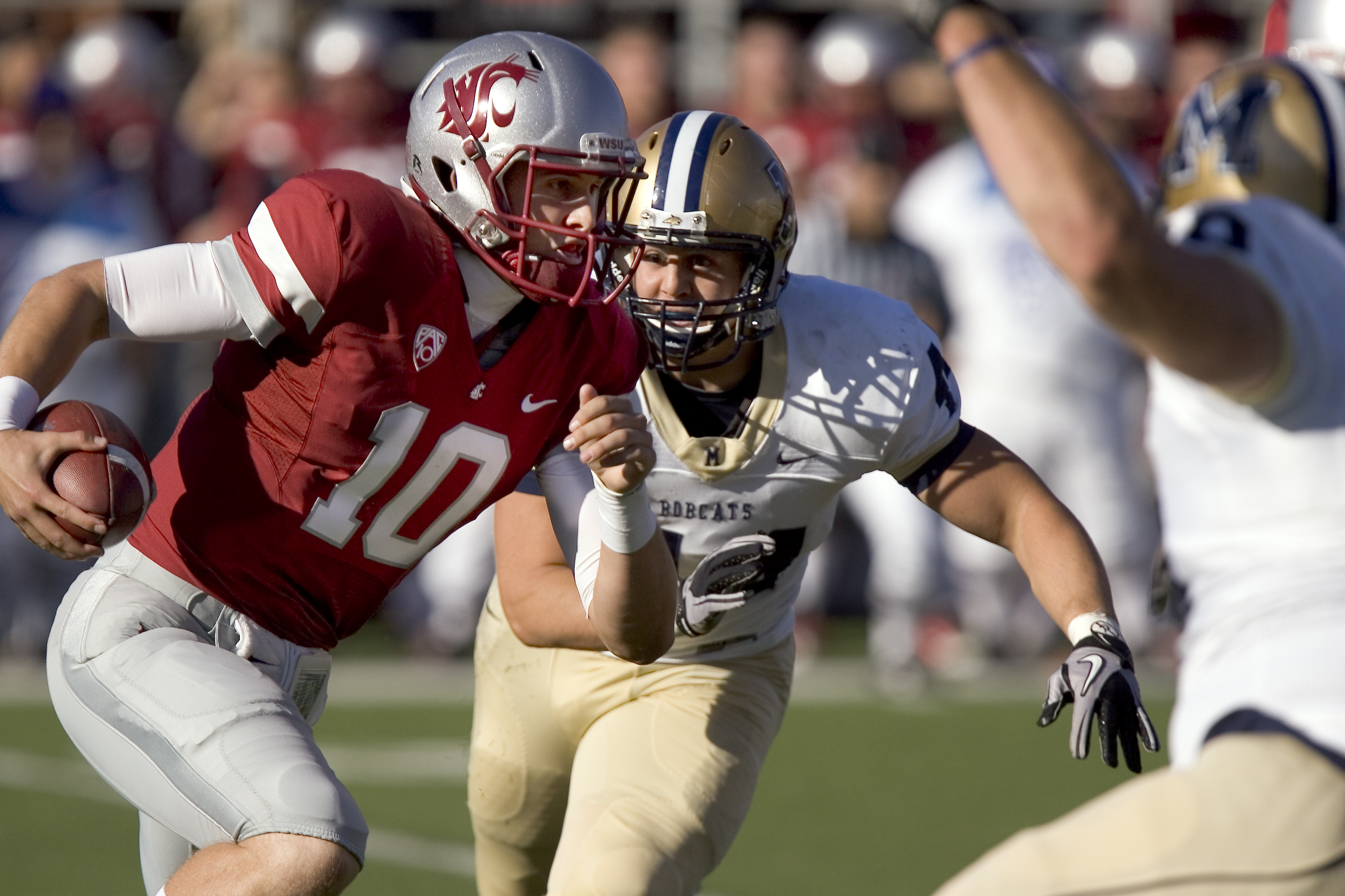 Washington State quarterback Jeff Tuel (10) scrambles while pursued by Montana State linebacker Aleksei Grosulak during the first quarter of an NCAA college football game today at Martin Stadium in Pullman, Wash. (AP Photo/Dean Hare)