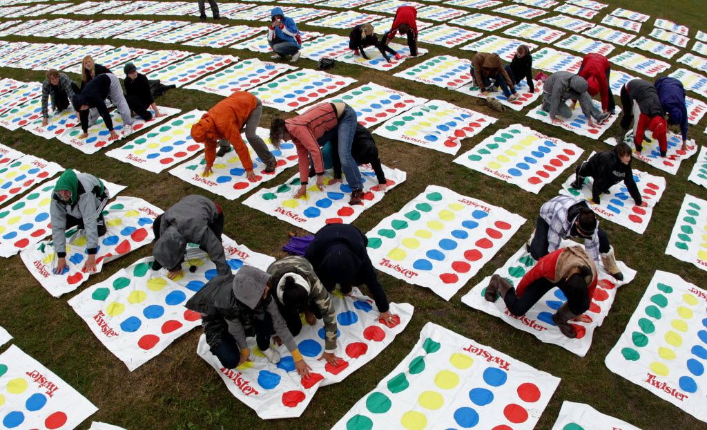 People play Twister in an attempt to set a world record for the most people playing the game together, at the University of British Columbia in Vancouver, Canada, Sunday. Organizers came up short of the record of 4,160 people with only a few dozen attending due to poor weather. You write the cutline. (AP Photo/The Canadian Press, Darryl Dyck)
