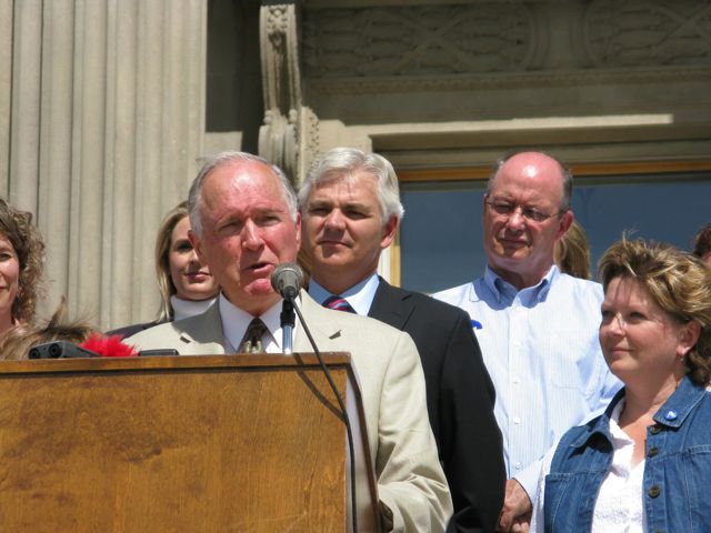 More than half those assembled on the Statehouse steps today were members of Allred’s Common Interest citizen group, which collaborated to take positions on issues for which Allred then lobbied the state Legislature. Former GOP state lawmaker Dennis Hansen, who was appointed to the Idaho Public Utilities Commission by GOP Govs. Phil Batt and Dirk Kempthorne and who once gave a Lincoln Day speech for Otter when Otter was running for lieutenant governor, said, “I am a very strong, committed Republican. … The issues facing Idaho and this nation are some of the most challenging that I have seen. … We need somebody that has the ability and leadership to reach consensus and move us forward, which has lacked the last four years.”