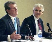 (Butch Otter, left, and his Democratic rival Keith Allred speak at a City Club of