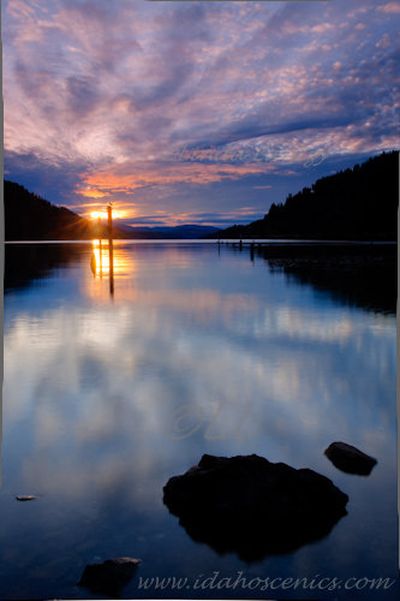 On her Idaho Scenic Images Facebook page , Linda Lantzy posts the photo above and this cutline information: “On the way to dinner tonight, I detoured out to Wolf Lodge Bay. The sun only lines up across the bay during a few weeks in spring and fall. Looks like I almost missed it this year.”