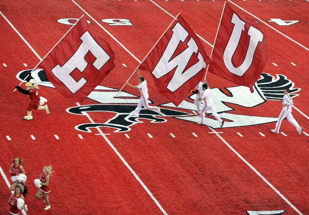 Eastern Washington cheerleaders and the mascot run on the new red turf at Roos Field on the Cheney, Wash., campus Saturday. Eastern Washington beat Montana won 36-27 in the first NCAA college football game played on the new turf. (AP Photo/The Spokesman-Review, Christopher Anderson)